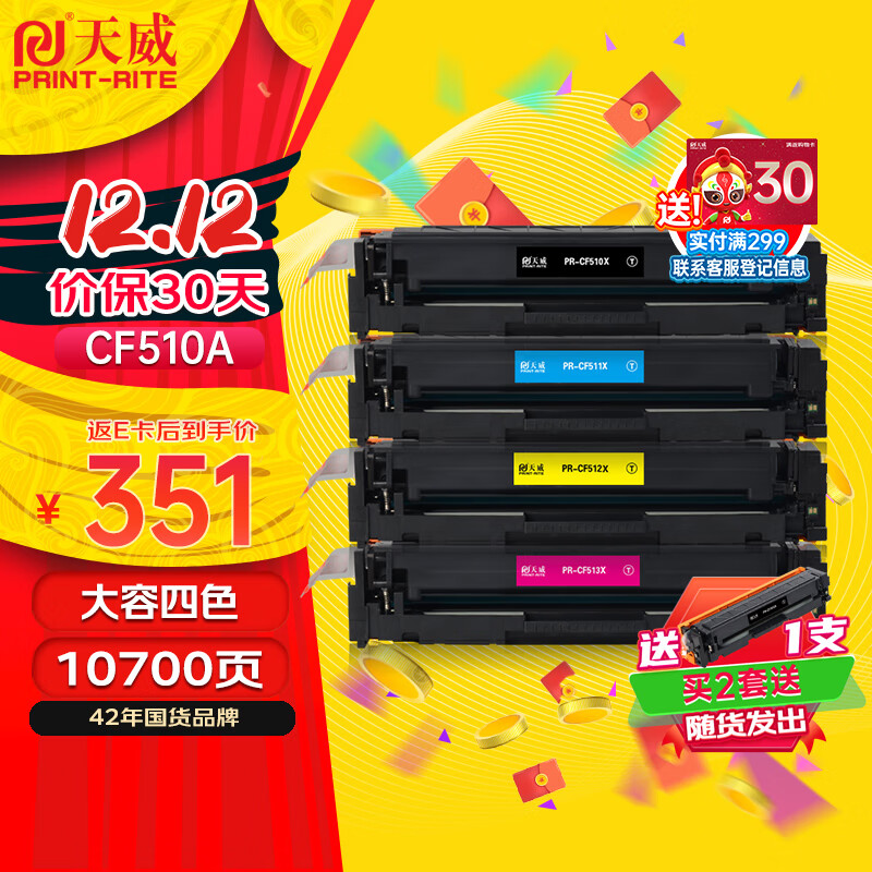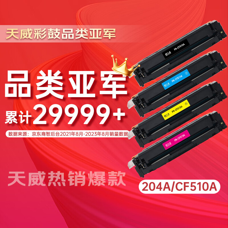 5、精挑细选了天威品牌的这一款cf510a硒鼓,品质非常好。四色套装,红黄蓝黑四种颜色。安装上就能使用。使用很方便。打印效果很好,适用惠普m154nw和m181fw等打印机机型。带芯片的大容量装,推荐选购。