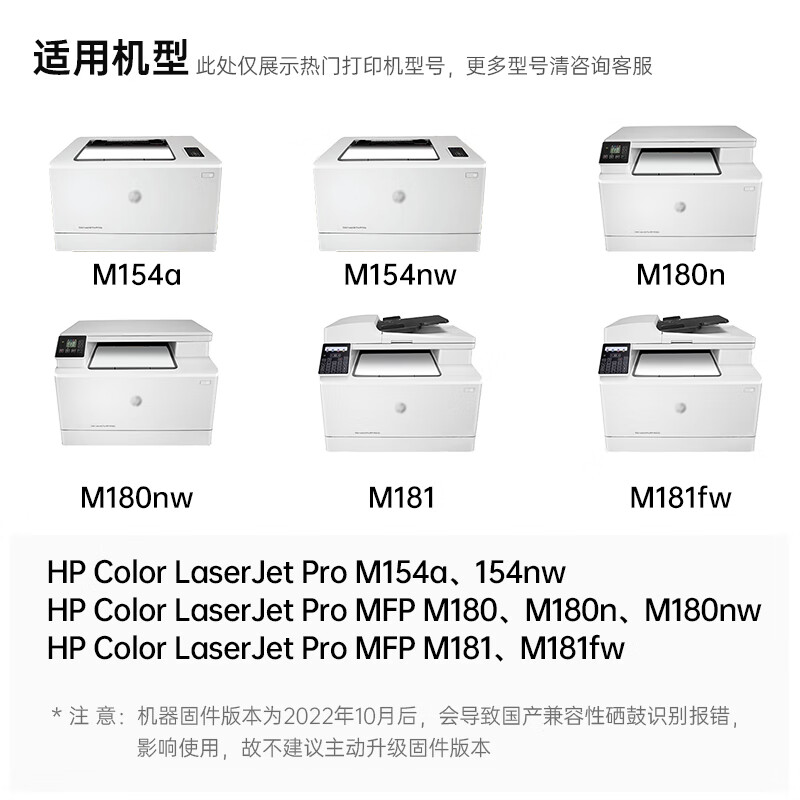 1、精挑细选了天威品牌的这一款cf510a硒鼓套装,品质很不错。适用惠普m154a等打印机型号。带芯片,安装上就能使用。而且打印效果也非常好。大容量四色套装,性价比很高。特别适合办公选用。推荐选购。