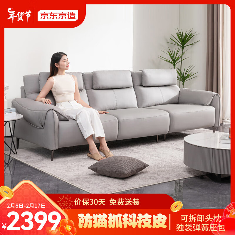 京东京造布艺沙发 防猫抓科技皮可拆卸头枕弹簧座包 客厅大户型2.7m灰ST05价格:2899.00元!