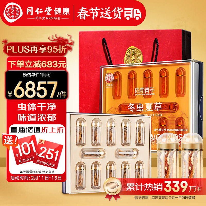 北京同仁堂【年货礼品】冬虫夏草-24/12g礼盒 虫体饱满 洁净度高 可泡酒磨粉 滋补品送父母长辈送礼价格:7069.00元!