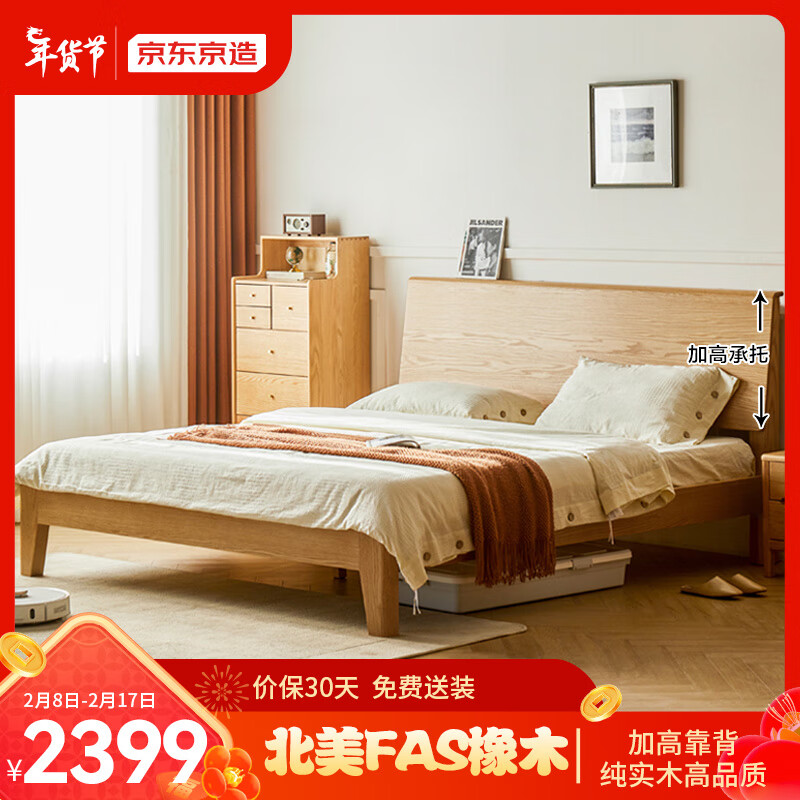 京东京造实木床 FAS级橡木|加高大板床头|加粗床腿 主卧双人床1.8×2米BW03价格:2599.00元!