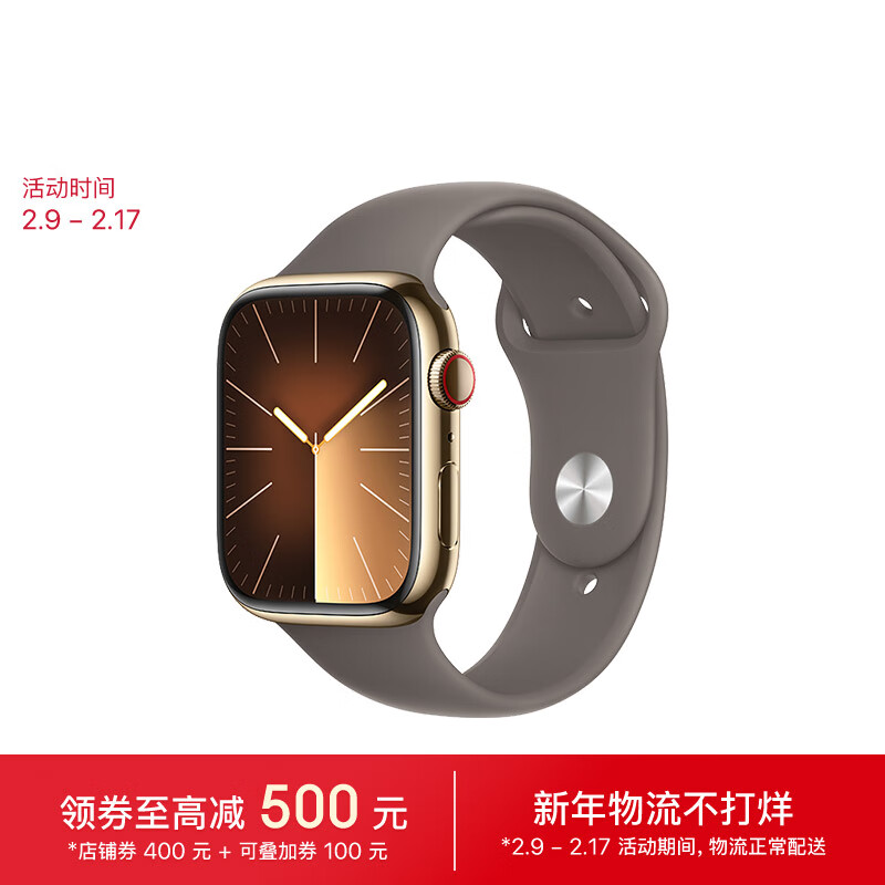 Apple/苹果 Watch Series 9 智能手表GPS+蜂窝款45毫米金色不锈钢表壳陶土色运动型表带M/L MRPL3CH/A价格:6199.00元!