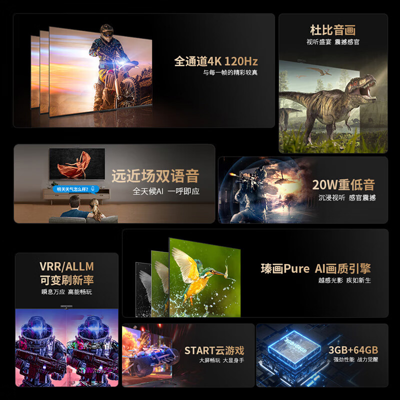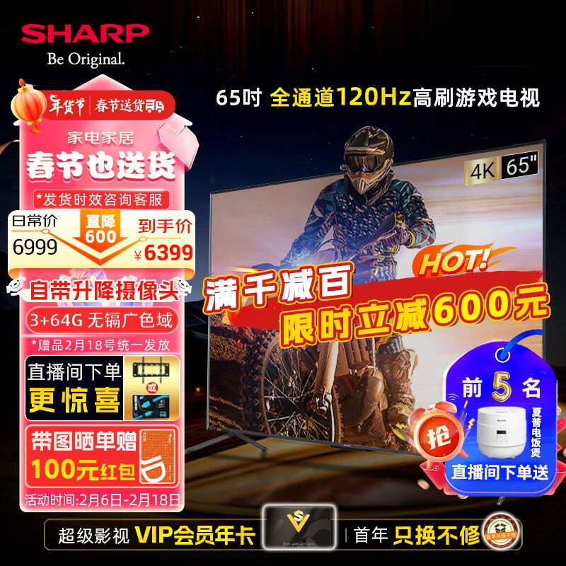 SHARP夏普4T-C65V7EA 65吋 全通道120Hz高刷 110%无镉广色域 3+64G 5扬声器20W重低音 HDMI2.1 游戏电视价格:6999.00元!