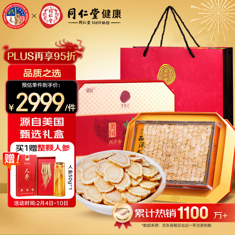 北京同仁堂【年货礼品】总统牌美国西洋参参片礼盒200g 0#切片花旗参 进口西洋参 送父母长辈送礼价格:2999.00元!