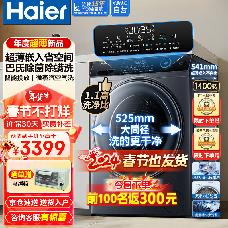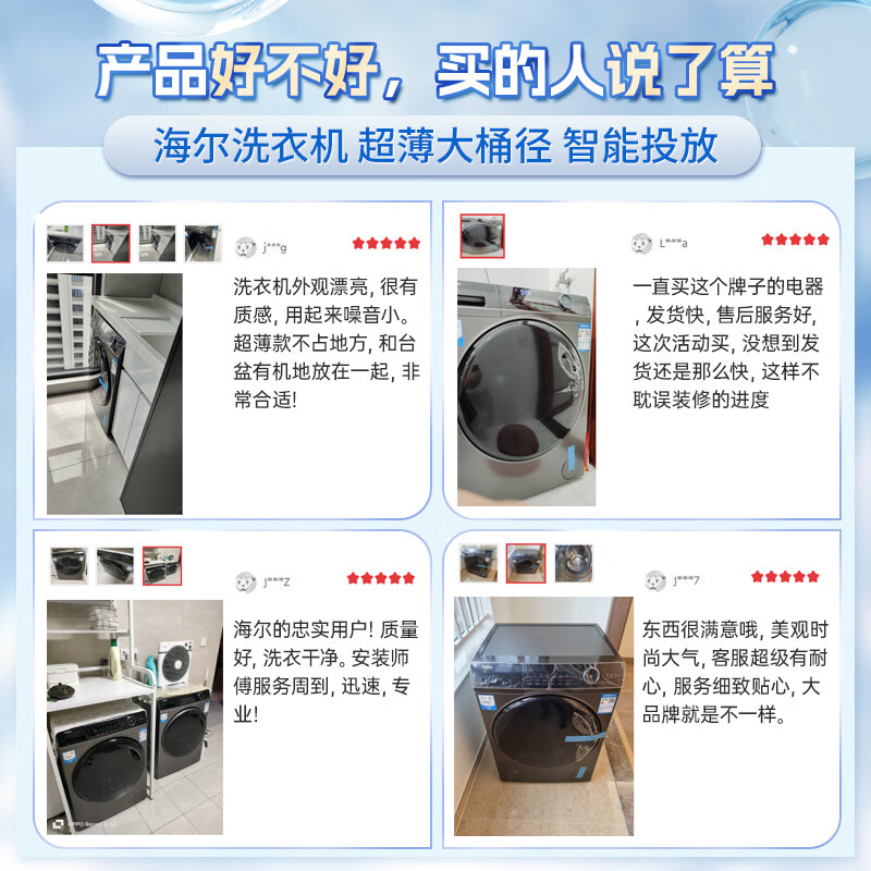 海尔(Haier)滚筒洗衣机10公斤全自动洗烘一体变频超薄嵌入525mm大筒径智能投放空气洗1.1洗净比EG100HBD309LS价格:3399.00元!