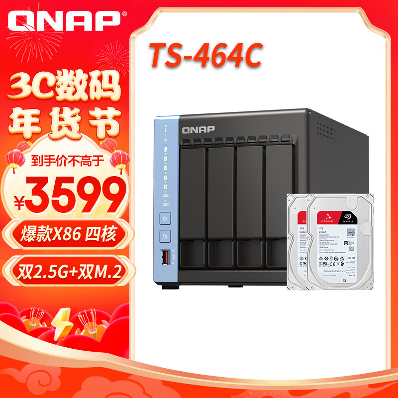 威联通(QNAP)TS-464C 魔方 四核心处理器网络存储服务器内置双M.2插槽NAS(含希捷酷狼4T*2)价格:3799.00元!