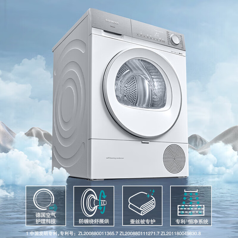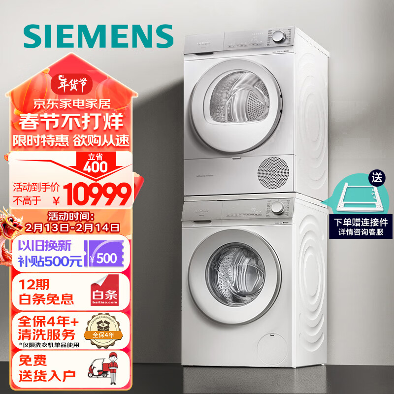 西门子(SIEMENS)轻颜洗烘套装 10kg智能除渍滚筒洗衣机全自动+10kg热泵烘干机家用 WG54B2X00W+WQ55B2D00W价格:11399.00元!