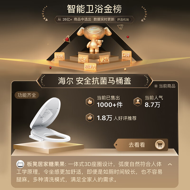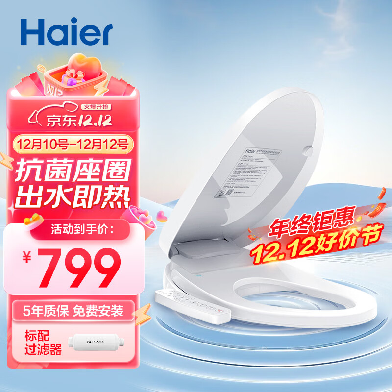 海尔(Haier)卫玺 智能马桶盖 活水即热电动加热抗菌坐便盖 自动夜灯 V-117价格:1099.00元!