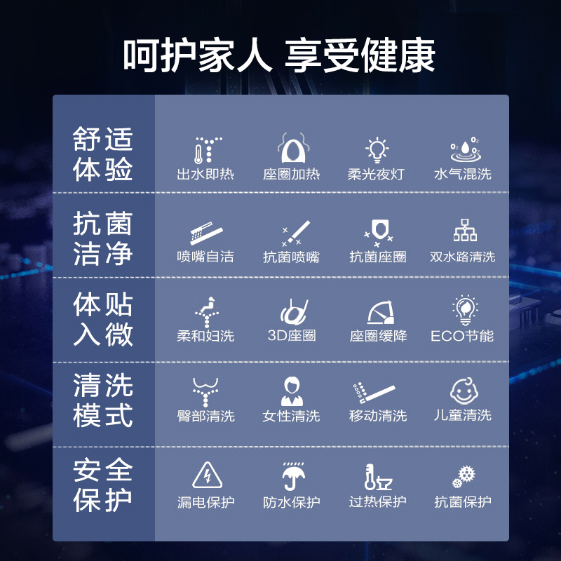 功能:臀部清洁,座圈加热,喷嘴自洁,喷嘴移动清洗,女性清洗,儿童清洗,记忆功能,净化水质,夜灯照明