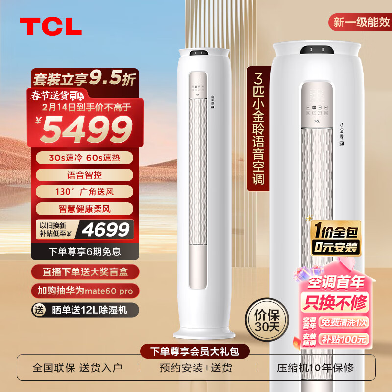 TCL空调3匹新一级能效变频冷暖 小金聆 语音智能客厅空调立式柜机一价全包KFR-72LW/RT7Ga+B1以旧换新价格:5499.00元!