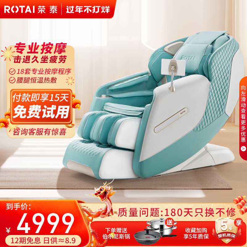 荣泰(RONGTAI) 按摩椅家用全身太空舱零重力多功能智能电动按摩沙发椅子生日礼物 A50 苹果绿价格:4999.00元!