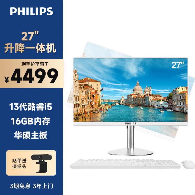 飞利浦S9 27英寸旋转升降台式一体机电脑 家用办公收银主机(13代 i5-13400 16G 512GSSD 双频WiFi)白色价格:4499.00元!
