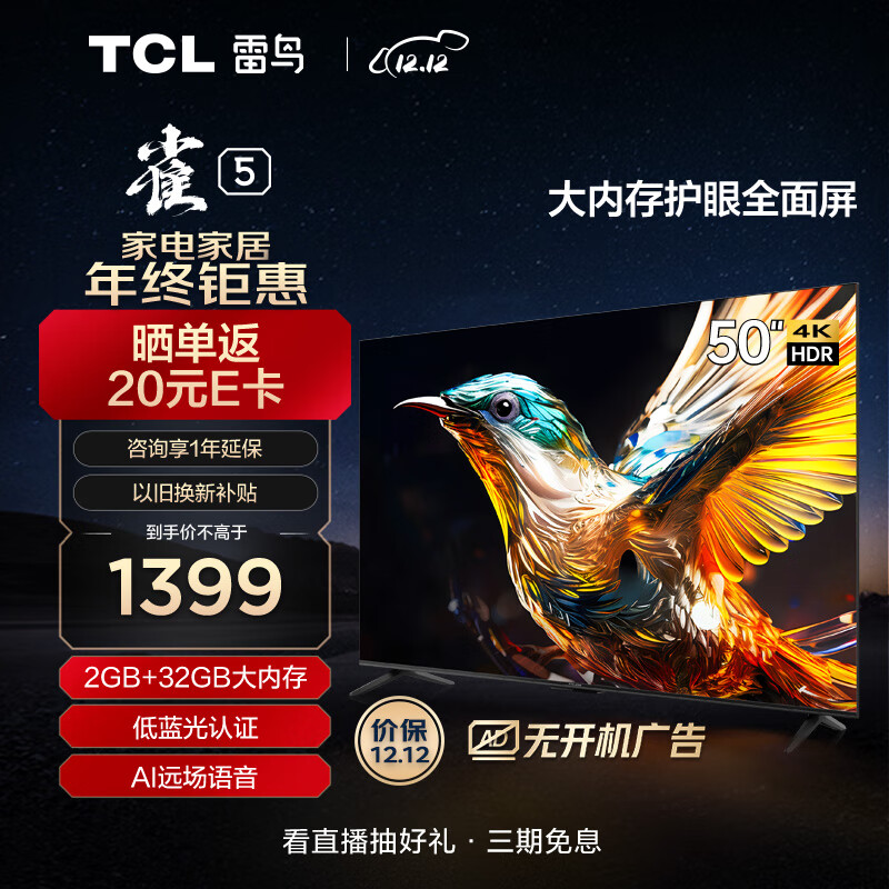 TCL雷鸟 雀5 50英寸电视 4K超高清 护眼防蓝光 超薄屏 2+32GB 游戏智能液晶平板电视机50F275C价格:1399.00元!