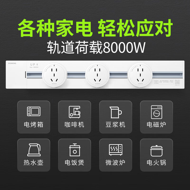 西门子(SIEMENS)经典款明装8000W轨道插座 可移动滑轨 墙壁插座 免打孔大功率新国标0.5米+3个五孔圆形插座白色价格:474.00元!
