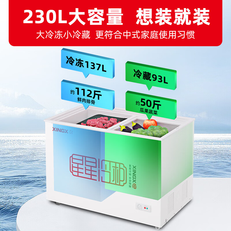 星星(XINGX) 230升 双箱双温冷柜 家用商用冰柜 蝴蝶门玻璃门 冷冻冷藏冰箱 BCD-230HE价格:1299.00元!