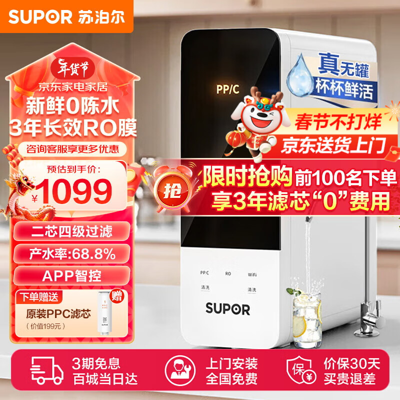 苏泊尔(SUPOR)净水器家用直饮机RO反渗透纯水机400G大通量过滤器DR2H1滤水器台下软水机厨下厨房净水机价格:1098.00元!