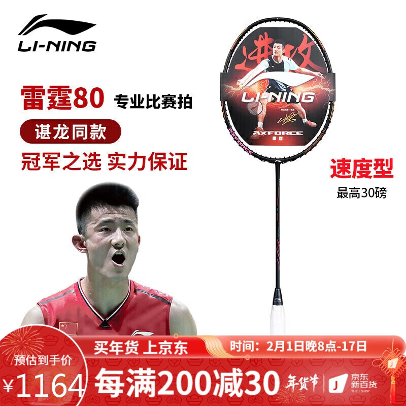 李宁(LI-NING)羽毛球拍谌龙同款全碳素单拍雷霆80专业大赛级球拍 4U空拍价格:1344.00元!