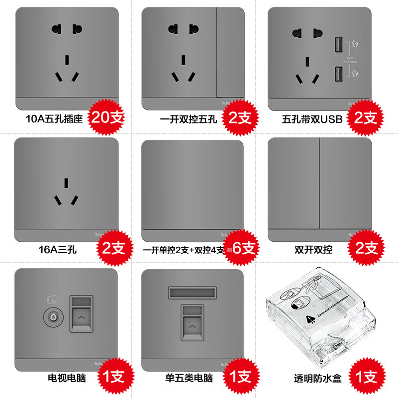 施耐德电气开关插座面板家用 五孔墙壁插座 二居室组合套装37支 绎尚灰价格:2850.16元!