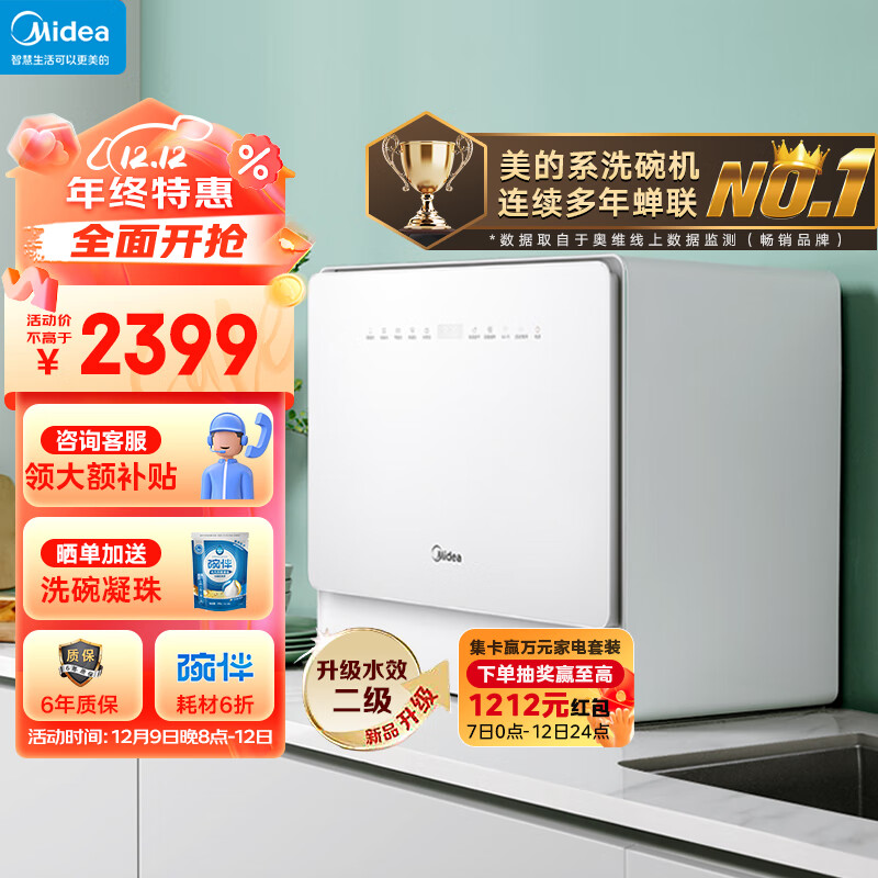 美的(Midea)5套 洗碗机台式 UP2(极地)升级二级水效 高温除菌 85℃热风烘干 三旋劲洗 双层碗篮 水果海鲜洗价格:2399.00元!