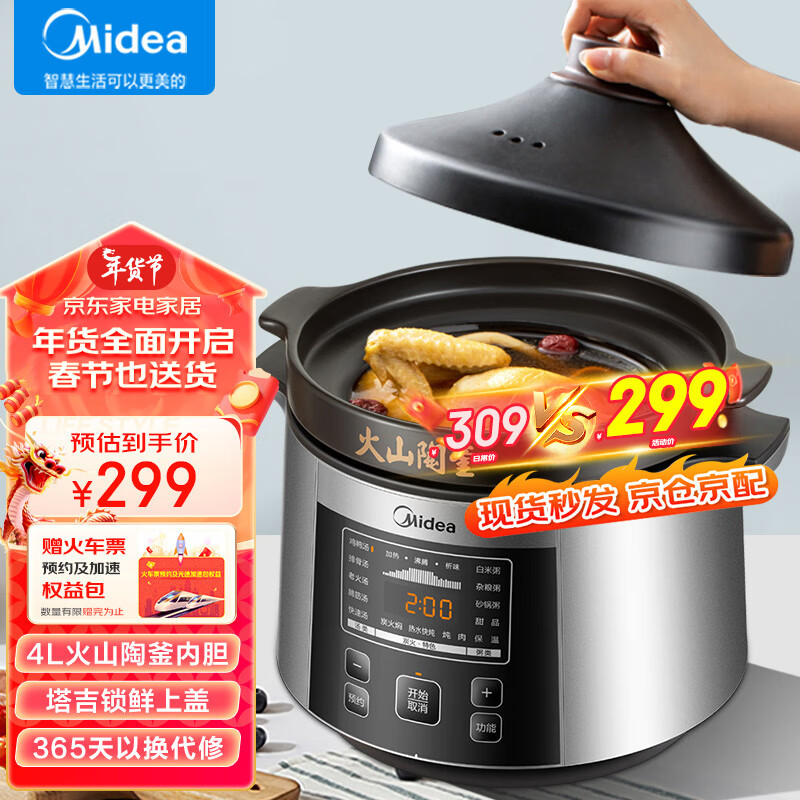 美的(Midea)电炖锅 电炖盅 煲汤锅炖汤锅 煮粥锅 精控快速火山陶釜 4L容量年货送礼赠老人送长辈 DGC4018价格:299.00元!