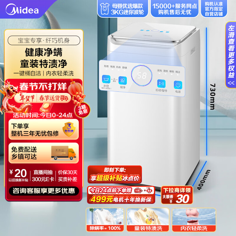 美的(Midea)波轮洗衣机全自动 MB30V10E 3公斤 迷你洗衣机小型 儿童洗衣机 婴儿洗衣机 内衣洗衣机 除螨价格:649.00元!