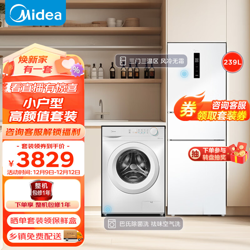 美的(Midea)小户型冰洗套装 三门一级风冷无霜租房宿舍小冰箱MR-251WTPE+10公斤滚筒全自动洗烘一体MD100V11F价格:4030.00元!