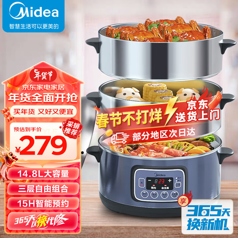 美的(Midea)电蒸锅多功能家用电火锅电煮锅电热锅三层大容量14.8L大容量智能预约MZ-ZG28Power501价格:309.00元!