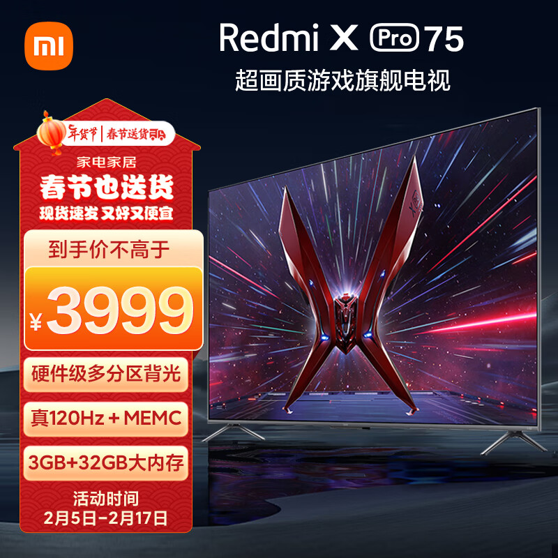 小米Redmi 游戏电视X Pro75英寸电竞原色屏多分区背光 120Hz高刷 智能电视L75R9-XP 以旧换新价格:3998.00元!