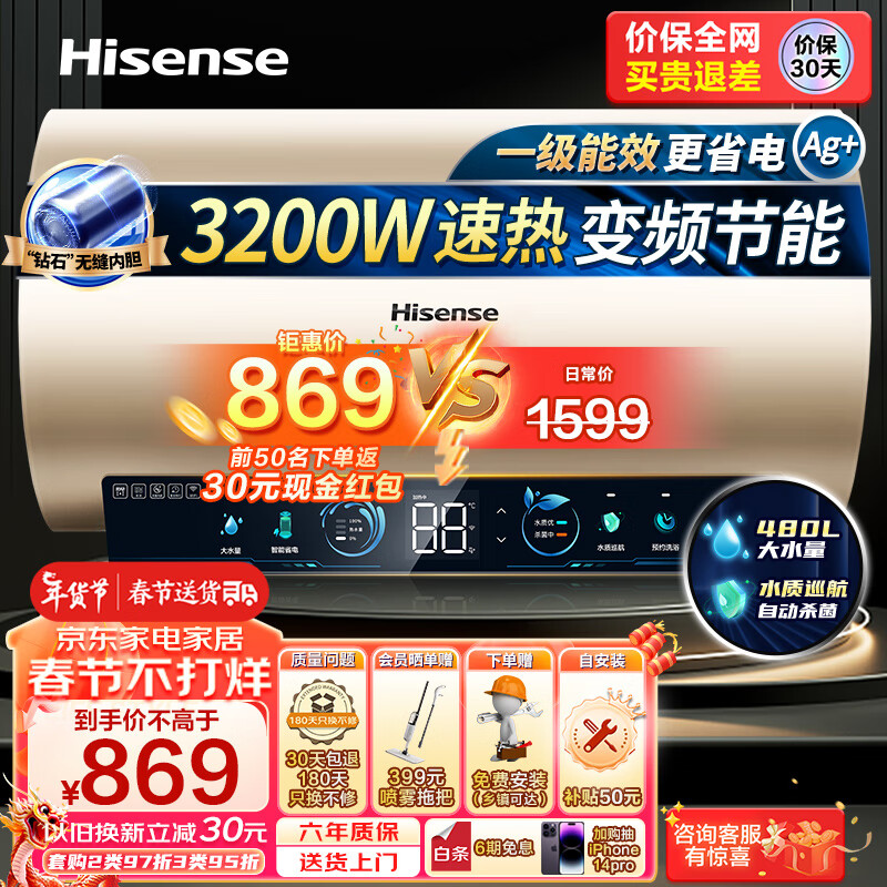 海信(Hisense)60升家用电热水器3200W变频速热8倍增容一级能效WIFI智能水质监测ES60-C309i智享 以旧换新价格:999.00元!