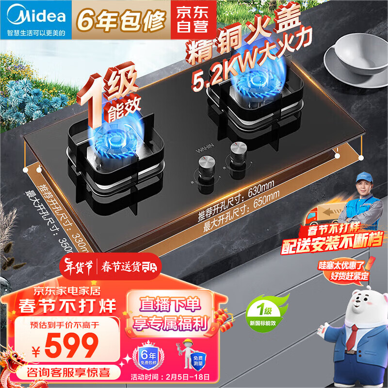 美的(Midea)出品燃气灶天然气灶双灶猛火灶炉灶 铜火盖一级能效 5.2kW大火力灶台灶具 天然气灶 WAHIN JZT-HQ8价格:579.00元!