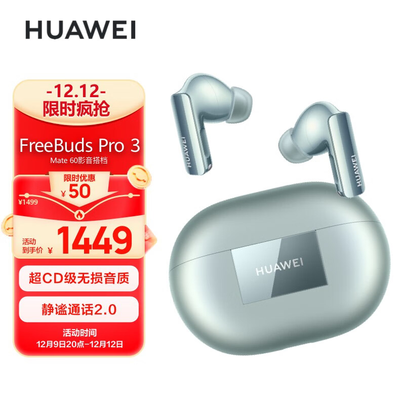 华为(HUAWEI)FreeBuds Pro 3 真无线蓝牙降噪耳机 入耳式动态降噪/游戏影音/离线查找/适用Mate 60 雅川青价格:1449.00元!