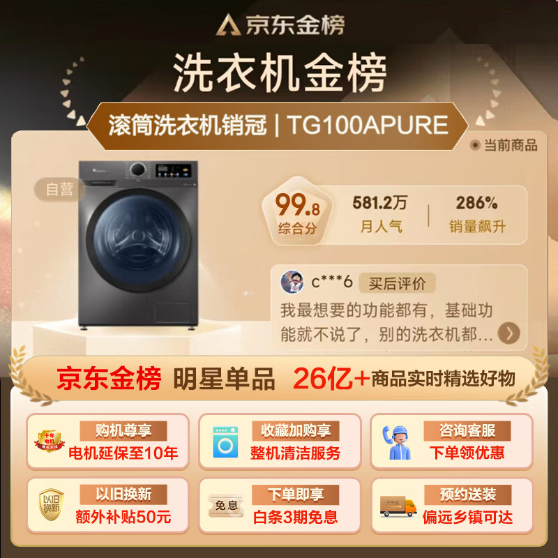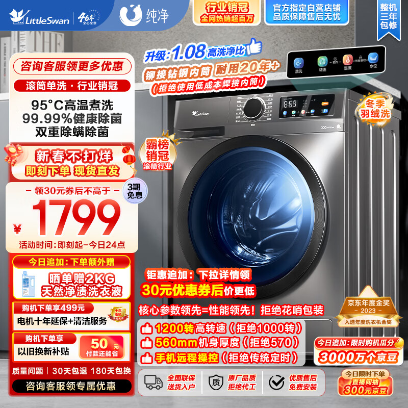 小天鹅(LittleSwan)滚筒洗衣机全自动 10公斤大容量 1.08高洗净比 除菌净螨 炫彩按键 以旧换新 纤薄机身 TG100APURE价格:1798.00元!