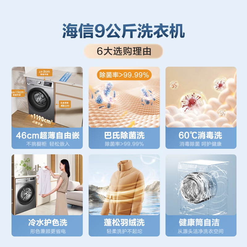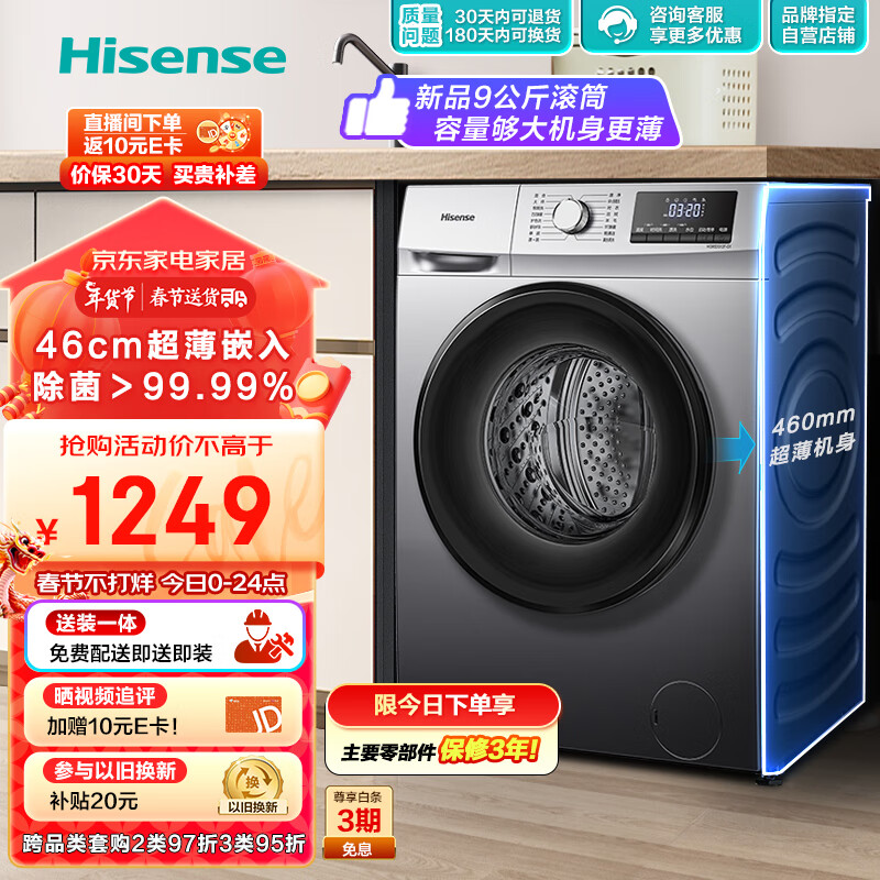 海信(Hisense)滚筒洗衣机全自动 9公斤家用大容量 超薄节能 智能洗除菌HG90DG12F-G1以旧换新价格:1249.00元!