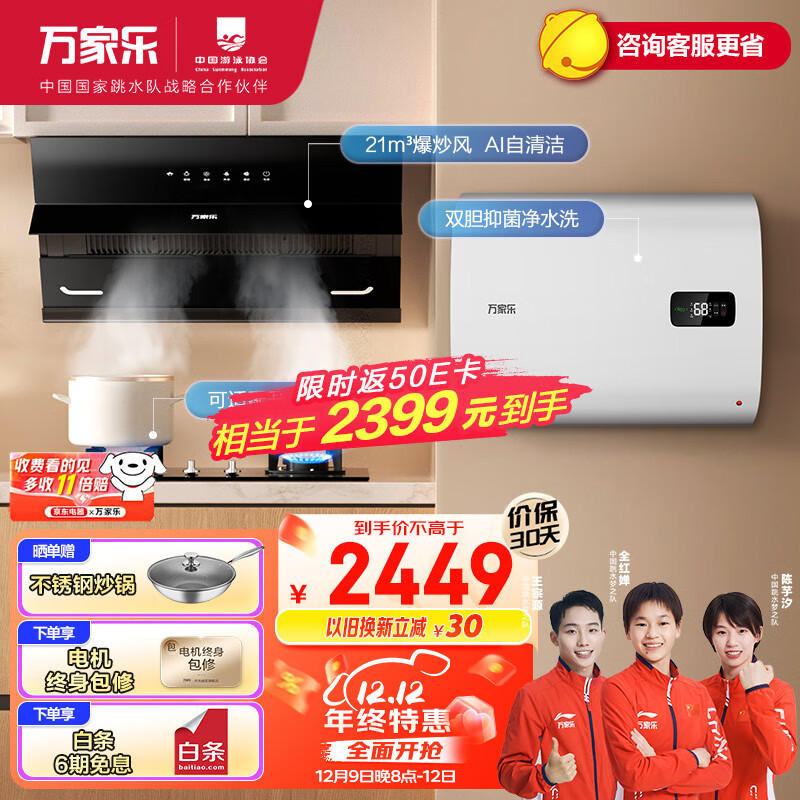 万家乐烟灶热厨卫三件套 21立方烟灶套装50L扁桶WIFI智控电热水器多件套装AJ4+AY4C+50FB0天然气价格:2649.00元!