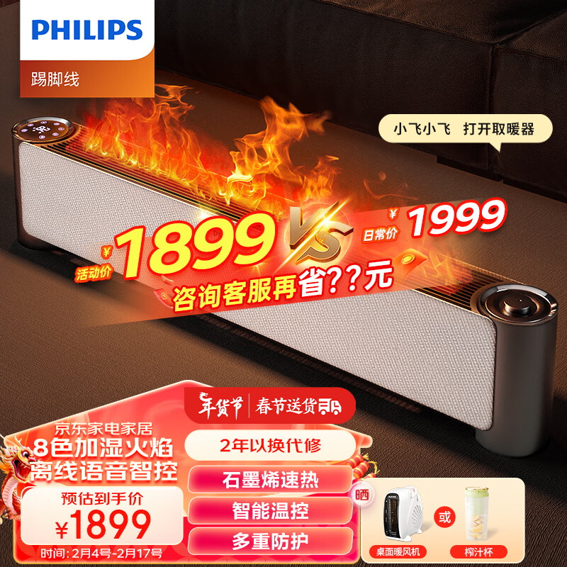 飞利浦(PHILIPS) 石墨烯踢脚线取暖器家用电暖气片电暖器3D仿真加湿火焰智能语音控制移动地暖 AHR5144KX价格:2665.00元!