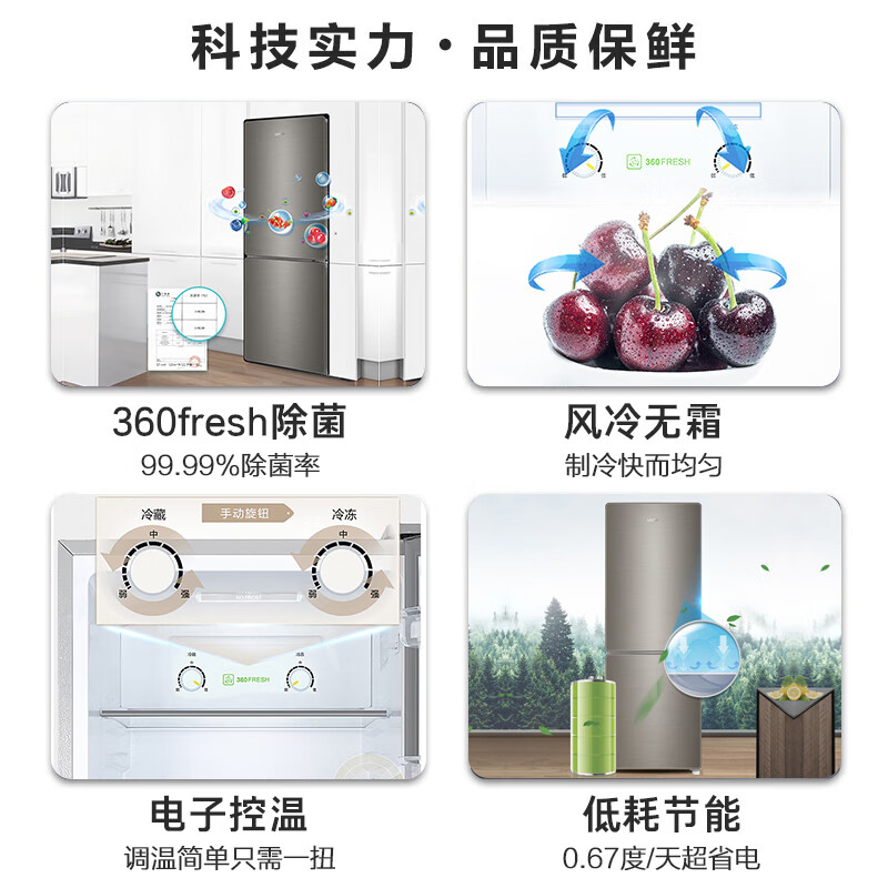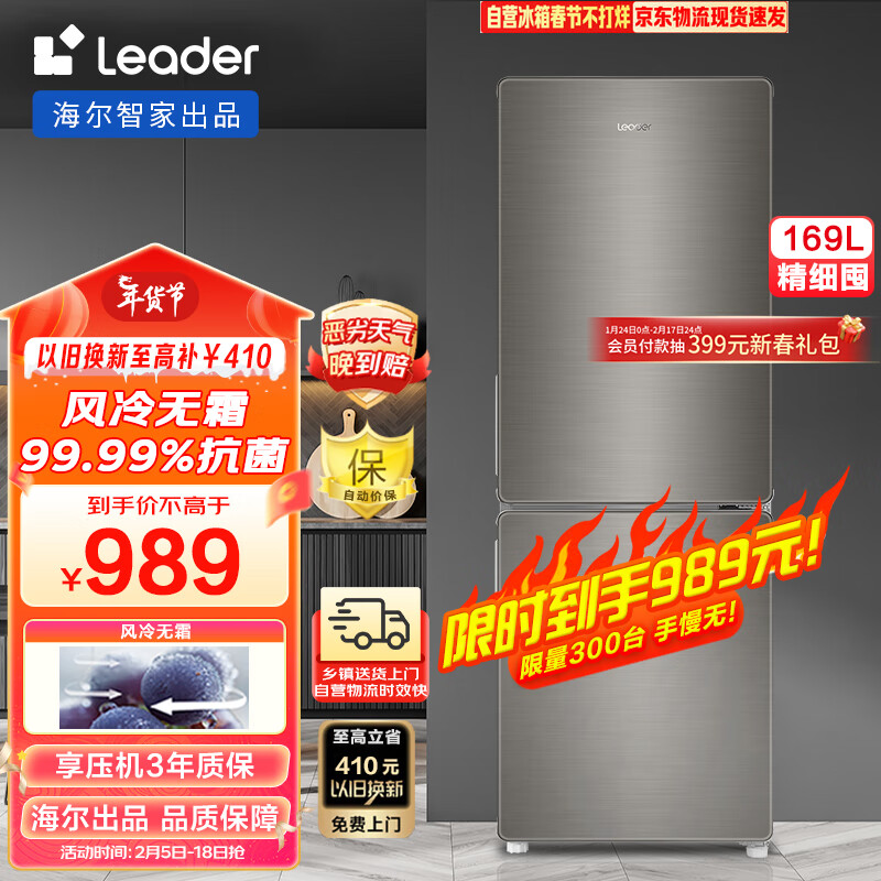 Leader 海尔智家出品169升风冷无霜二门冰箱家用以旧换新超薄两门小型宿舍租房节能电冰箱BCD-169WLDPD价格:989.00元!