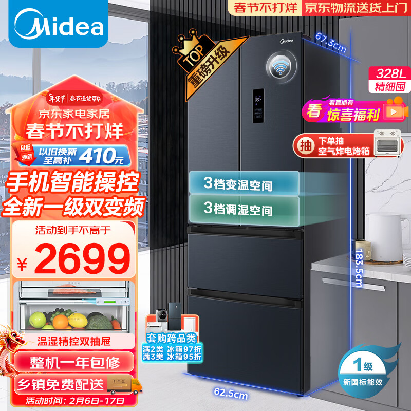 美的(Midea)345变频一级能效法式多门四开门小型家用电冰箱风冷无霜MR-345WFPZ1E大容量三档变温价格:2799.00元!