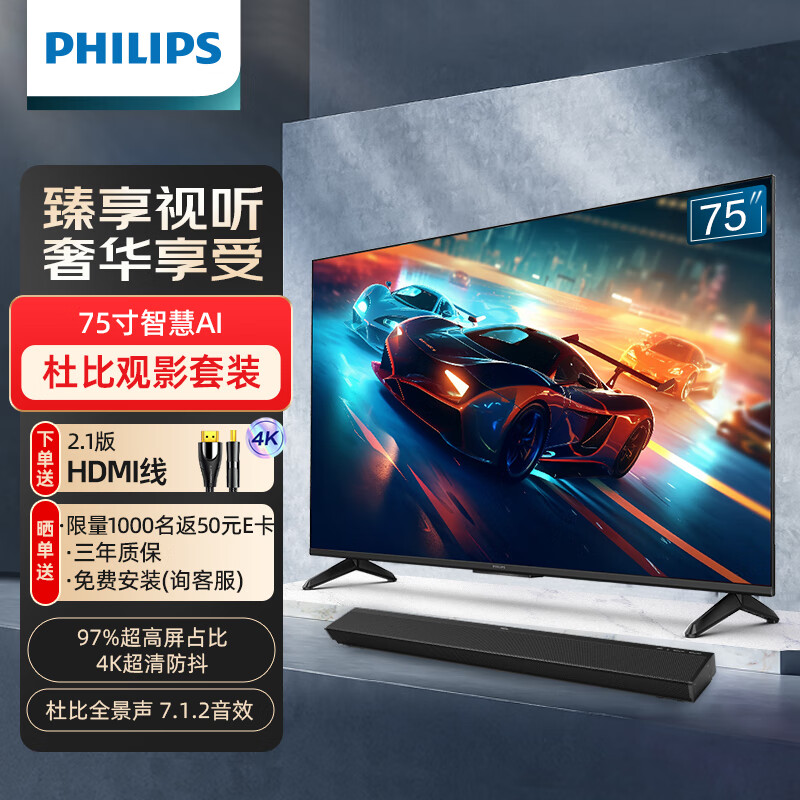 飞利浦(PHILIPS)75英寸电视75PUF7108+B600杜比全景声回音壁套装组合 97%屏 7.1.2音效价格:4998.00元!