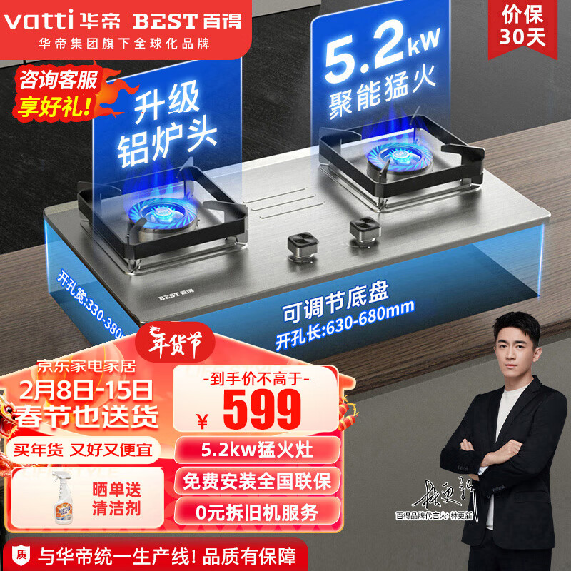 百得(BEST)华帝出品 煤气灶燃气灶天然气液化气双灶炉具 5.2KW家用不锈钢面板猛火台嵌入两用式灶JZT-QE50G价格:699.00元!