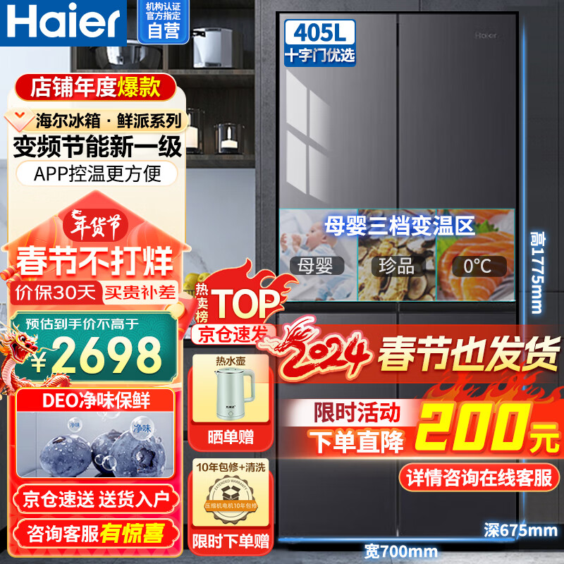 海尔(Haier)冰箱鲜派405升十字四开门风冷无霜超薄家用大容量净味APP控温双变频新一级节能BCD-405WLHTDEDS9U1价格:2698.00元!