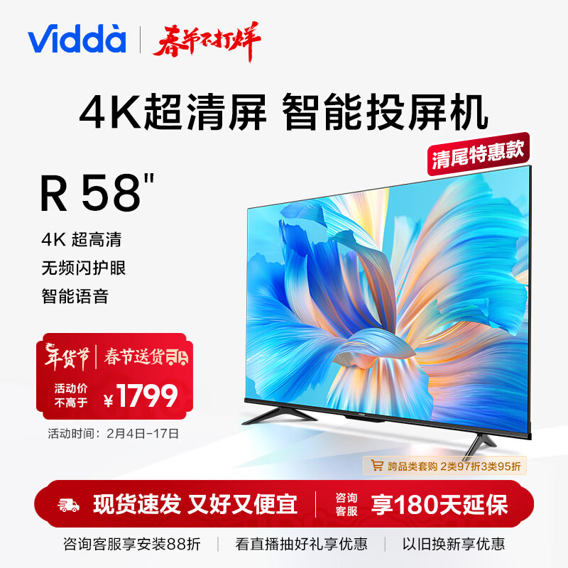 Vidda 海信 R58 58英寸 超高清 超薄屏电视 智慧屏 教育电视 游戏巨幕智能液晶电视以旧换新58V1F-R价格:1799.00元!