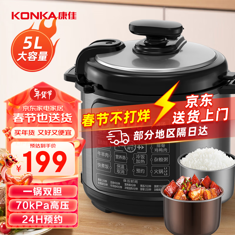 康佳(KONKA)智能电锅 5L家用多功能 不粘内胆 智能预约 收汁入味 大火力 高压锅 KYLG-5006E-W(SD)价格:199.00元!