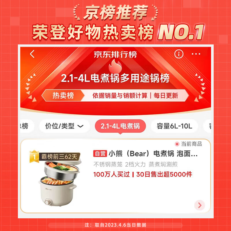 小熊(Bear)电煮锅 泡面火锅宿舍小电锅 多功能多用途电热锅 2.5L蒸煮一体蒸屉蒸笼电蒸锅 DRG-E25H1价格:108.00元!