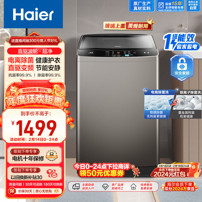 海尔(Haier)波轮洗衣机全自动小型 直驱变频电机 10公斤大容量 电离除菌 羊毛洗 速洗 以旧换新EB100B22Mate2价格:1499.00元!