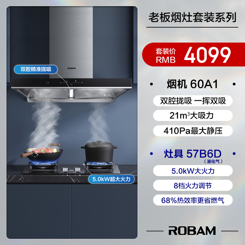老板(Robam) 抽油烟机 灶具烟灶套装21大风量双腔欧式吸油烟机燃气灶烟机灶具套装60A1+57B6DY(液化气)价格:4099.00元!