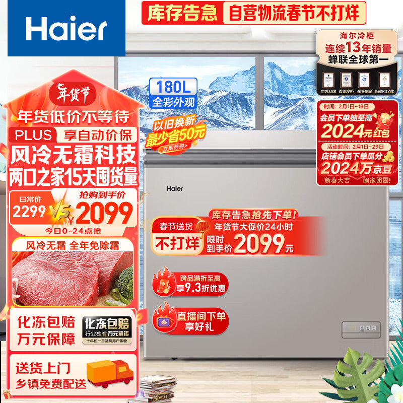 海尔(Haier)180升彩晶风冷商用家用冰柜 京东小家冷藏冷冻小冰柜家用小型冰箱冷柜BC/BD-180WEGU1以旧换新价格:2099.00元!
