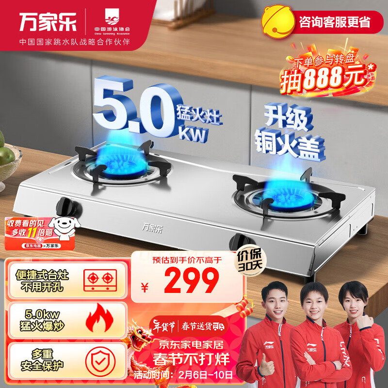 万家乐燃气灶具 5.0kW大火力液化气灶 不锈钢台灶煤气灶双灶具 家用台式燃气灶具JZY-ITB91液化气价格:298.00元!