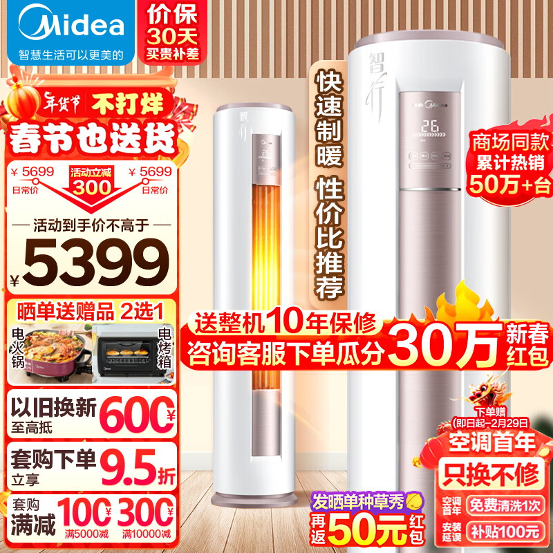 美的(Midea)空调 3匹智行 新三级能效变频冷暖自清洁智能家电 客厅立式空调柜机 KFR-72LW/BDN8Y-YA400(3)A价格:5399.00元!