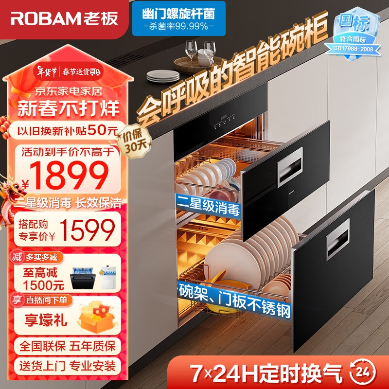 老板(Robam)消毒柜家用 嵌入式 消毒碗柜 105L双层大容量定时换气长效存储紫外线杀菌碗筷消毒柜XB711A价格:1899.00元!