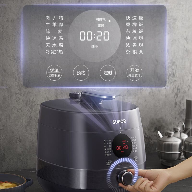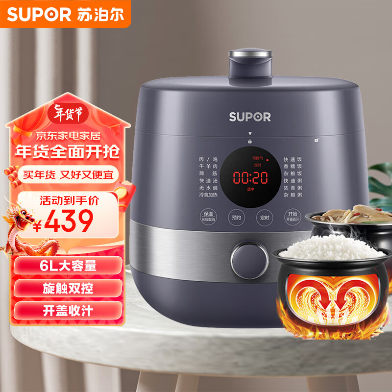 苏泊尔(SUPOR)全自动智能预约电锅6L家用智能预约蒸笼上蒸下煮旋钮触控面板双球釜内胆60FC8012Q高压锅4-8人价格:539.00元!